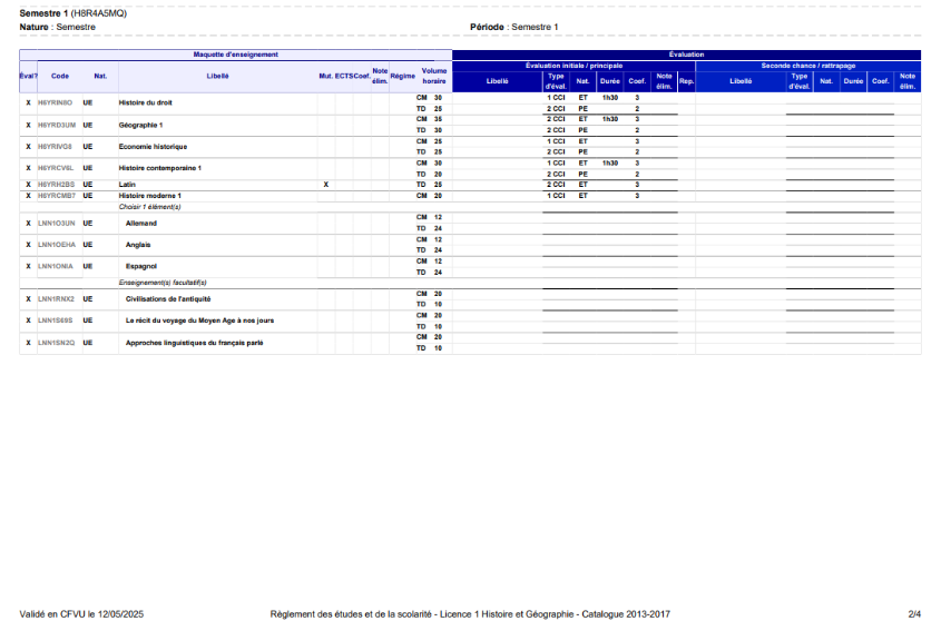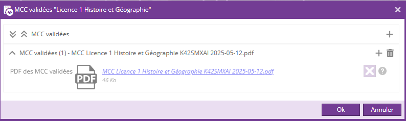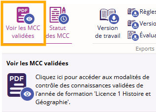 Le bouton Voir les MCC validées permet de télécharger le PDF généré lors de la validation du statut Saisie MCC contrôlée CFVU.