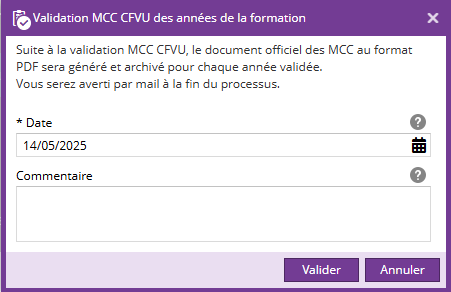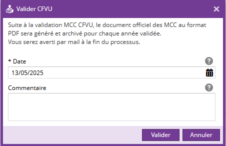 Une pop-up apparaît indiquant que le document document officiel des MCC sera généré et demandant de renseigner la date de validation et un commentaire (facultatif).