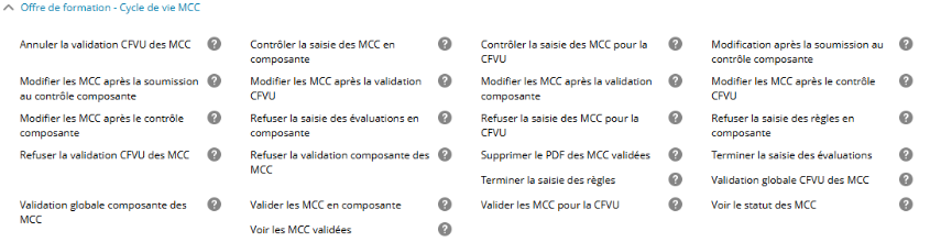 La liste des droits associés au cycle de vie MCC est la suivante (disponible dans la catégorie Offre de formation - Cycle de vie MCC)