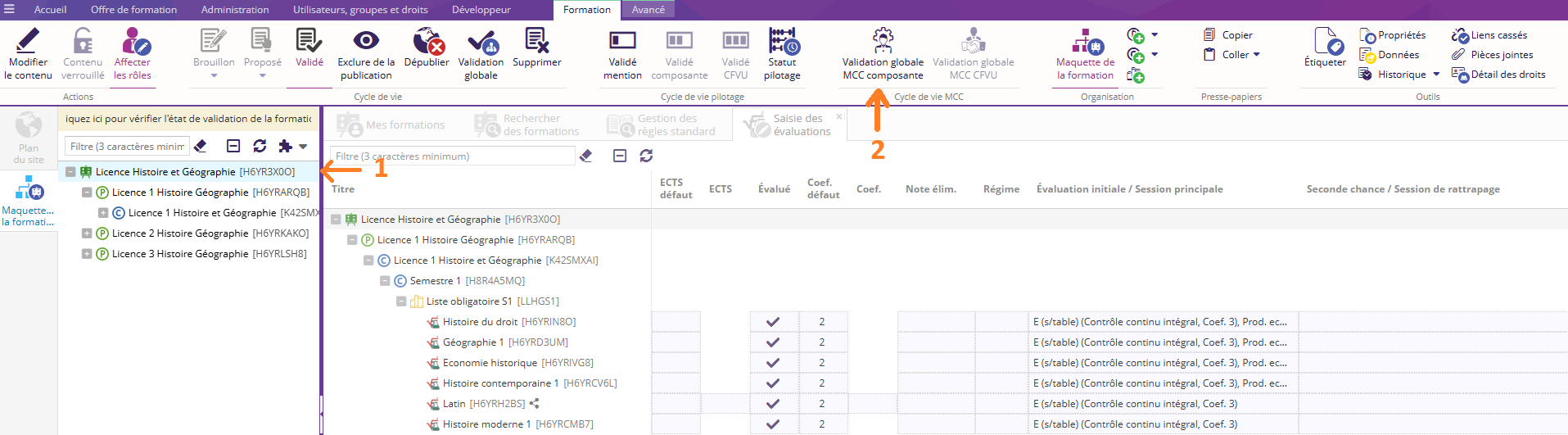 Cliquer sur la formation (1) puis sur Validation globale MCC composante (2)