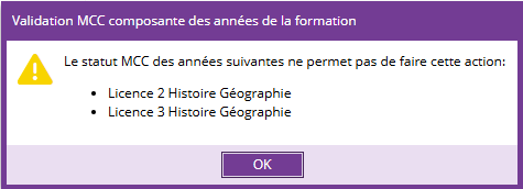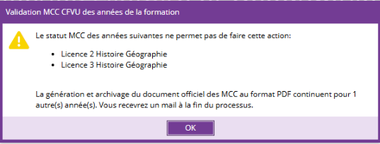 Si une ou plusieurs années ne permettent pas la validation globale, un message d'erreur apparaît et le document officiel des MCC n'est généré que pour la ou les années valides.