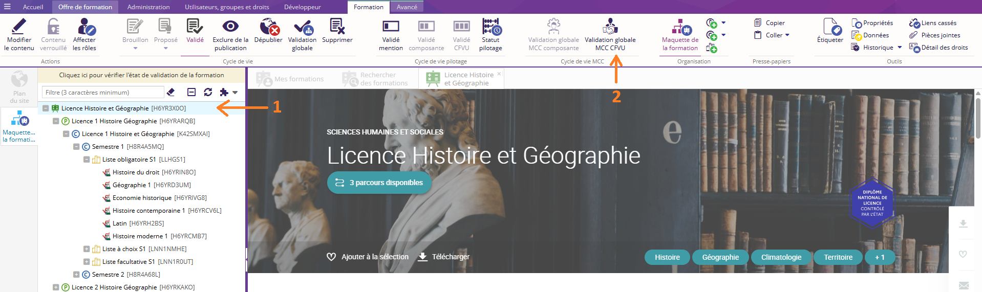 Cliquer sur la formation (1) puis sur Validation globale MCC CFVU (2)