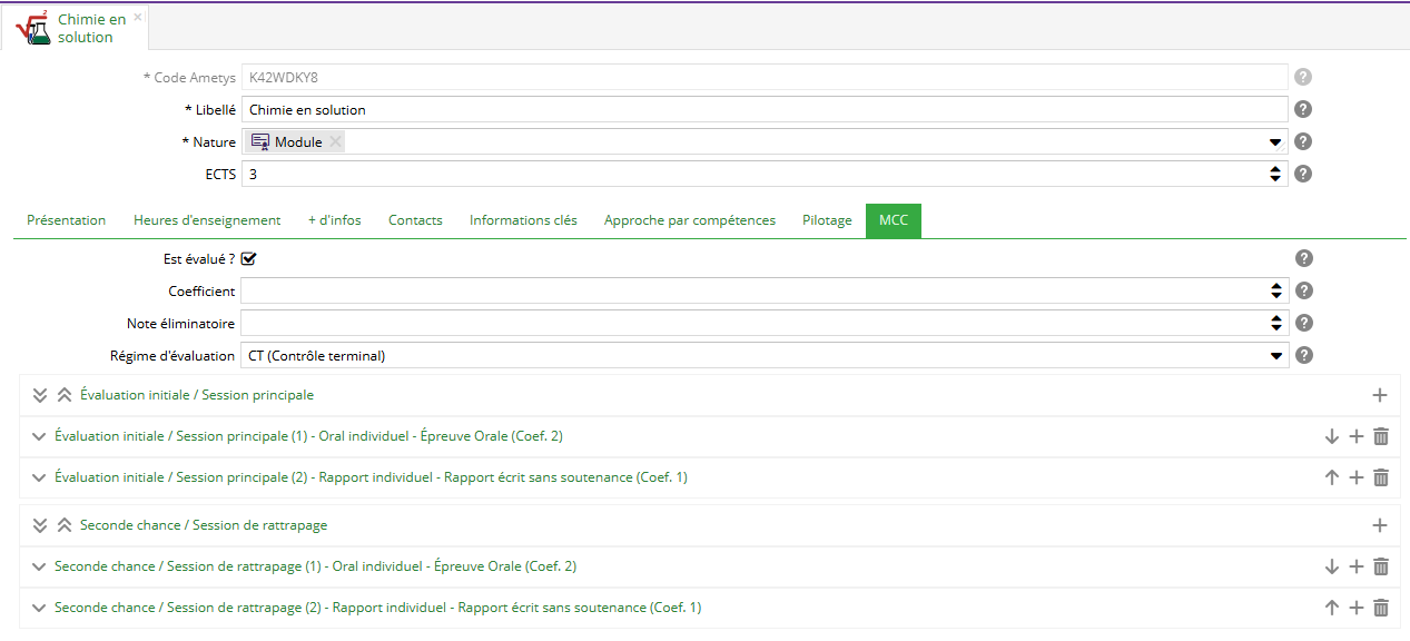 La saisie des MCC d'un ELP au niveau de l'onglet MCC est constituée :