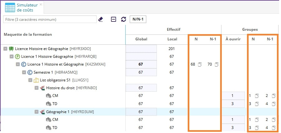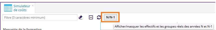 Un bouton N/N-1 est disponible à côté du filtre et permet d'afficher ou de masquer en un seul clic les 4 colonnes :