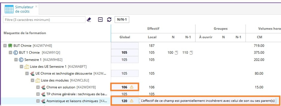 Si les informations nécessaires aux calculs du simulateur ne sont pas renseignées jusqu'au niveau des heures d'enseignement (par exemple si une étape est vide), les modifications effectuées ne sont pas prises en compte.