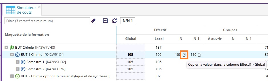Lorsque l'utilisateur change de formation ou de composante, ou s'il effectue des modifications sur une formation, il est nécessaire de cliquer de nouveau sur le bouton "Simulateur de coûts", afin que celui-ci soit complètement recalculé.