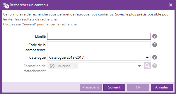 La recherche peut s'effectuer par plusieurs champs : Libellé, Code de la compétence ou Catalogue.
