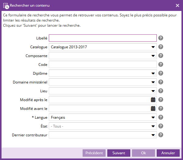 Elle se compose de plusieurs champs à remplir, selon la recherche souhaitée :