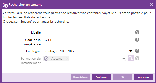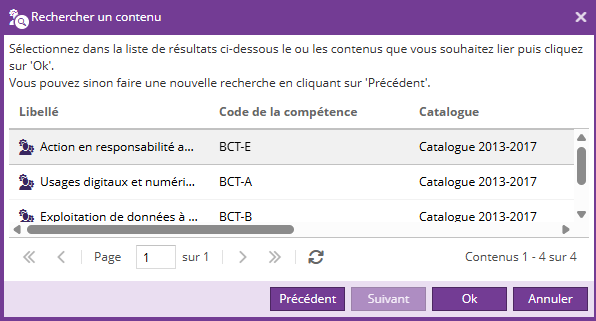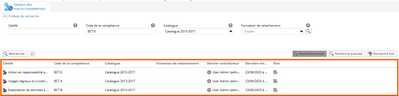 Par exemple, une recherche par code de compétence "BCT-E" sur le catalogue "Catalogue 2013-2017".