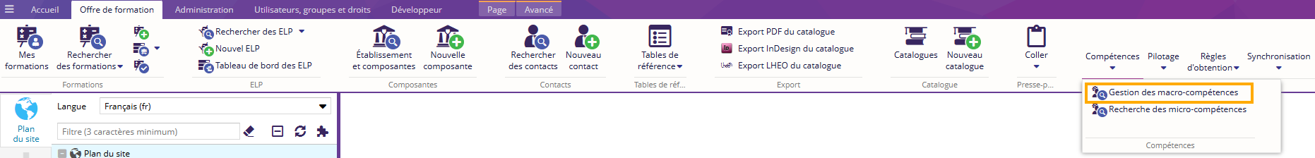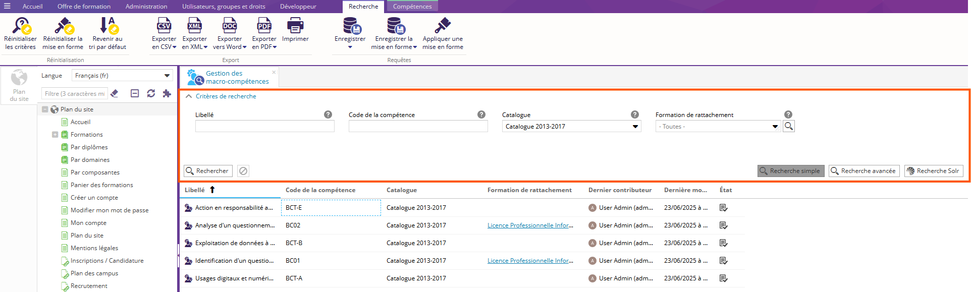 Le bouton Gestion des macro-compétences, situé au sein du ribbon Offre de formation, ouvre une fenêtre de recherche.