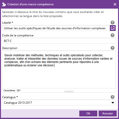 En cliquant sur le bouton "+" (encadré orange), la fenêtre de création de la macro-compétence s'ouvre.
