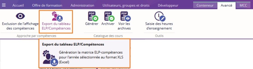 • Depuis un conteneur de type année, au niveau du groupe Approche par compétences de l'onglet Avancé.