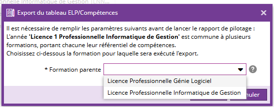Quand l'export ELP-Compétences est réalisé sur une année mutualisée entre plusieurs formations, une fenêtre permet de sélectionner la formation sur laquelle exécuter l'export :
