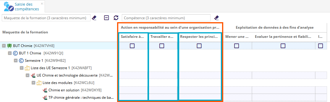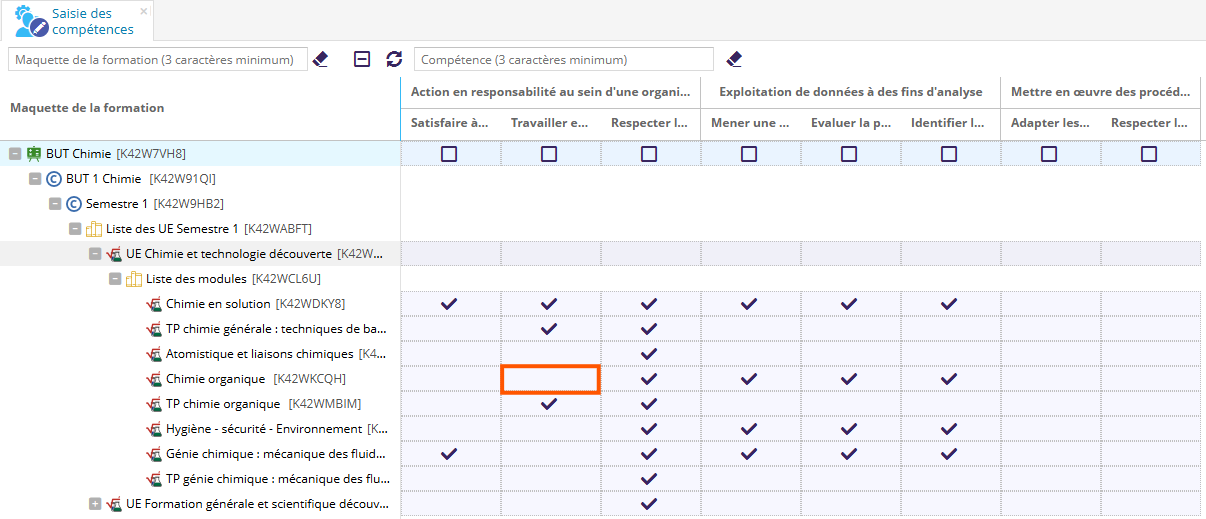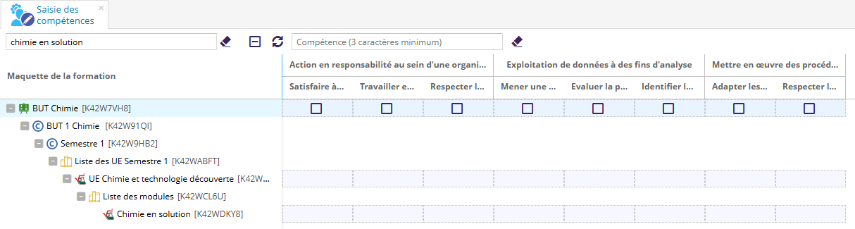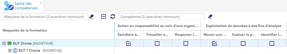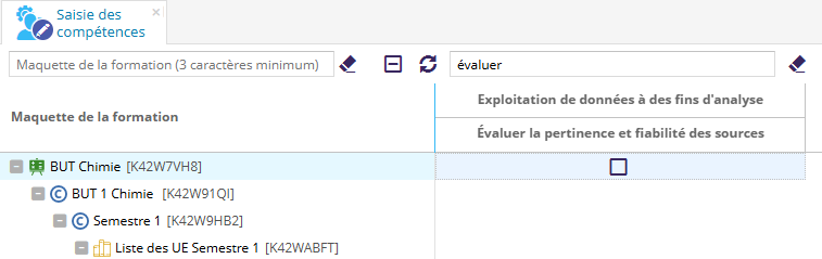 Exemple ici : seules les compétences répondant au filtre "évaluer" sont affichées :
