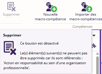 Lorsqu'une macro-compétence (transverse ou non) est déjà référencée dans un contenu, il n'est pas possible de la supprimer depuis l'outil Gestion des macro-compétences.