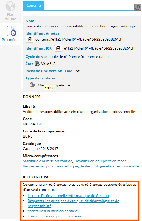 Pour connaître les formations attachées à une macro-compétence, il est possible d'utiliser l'outil Propriétés :