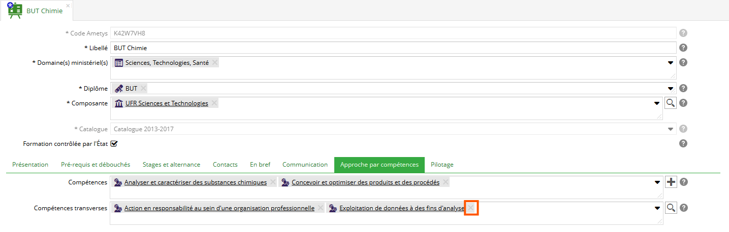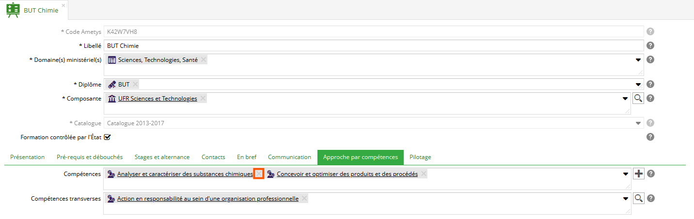 Dans le champ Compétences transverses, cliquer sur la croix à côté de la compétence (encadré orange)