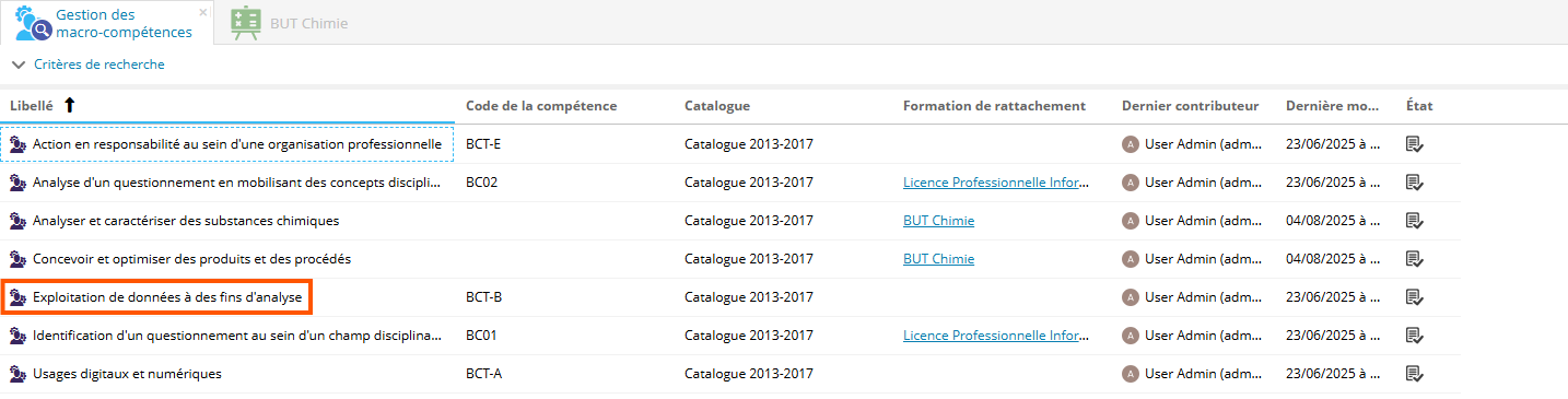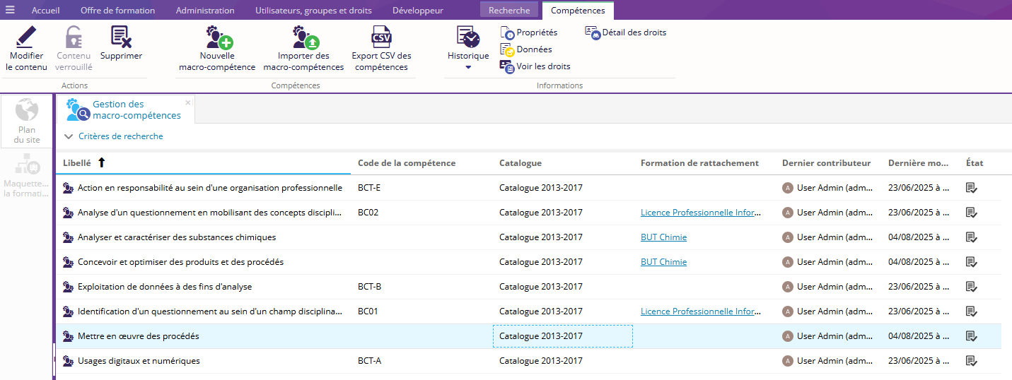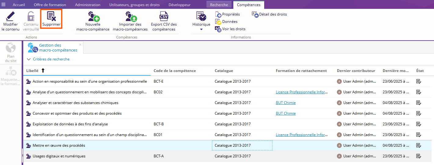 Depuis l'outil de gestion des compétences, seules les macro-compétences transverses peuvent être supprimées.