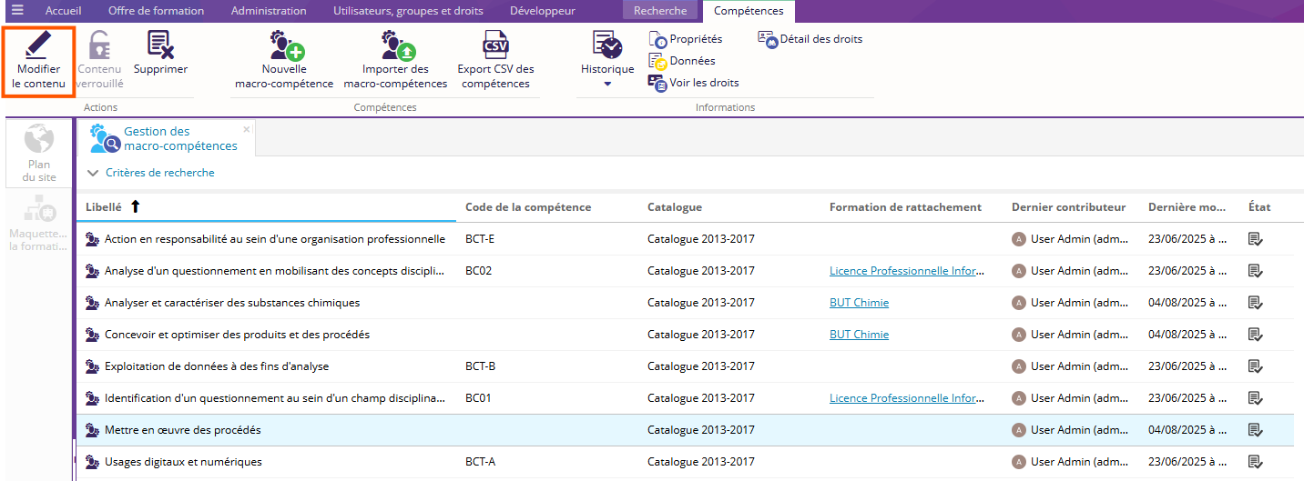 Sélectionner la macro-compétence souhaitée puis cliquer sur Modifier le contenu