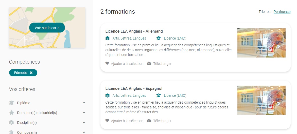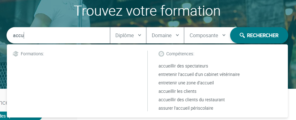 En entrant un texte dans la recherche, l'auto-complétion liste les compétences associées; un clic sur la compétence permet de retrouver la ou les formations ayant cette compétence.