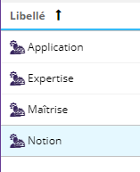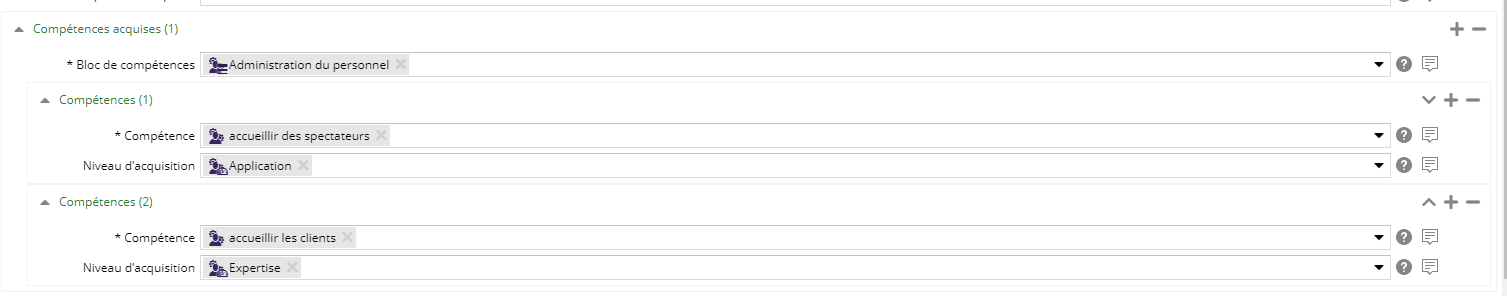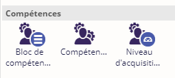 Ces compétences sont regroupées par bloc de compétences, et peuvent être acquises avec un niveau d'acquisition.