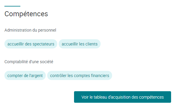 Les compétences sont affichées comme suit sur une formation ou un parcours, par bloc de compétence :
