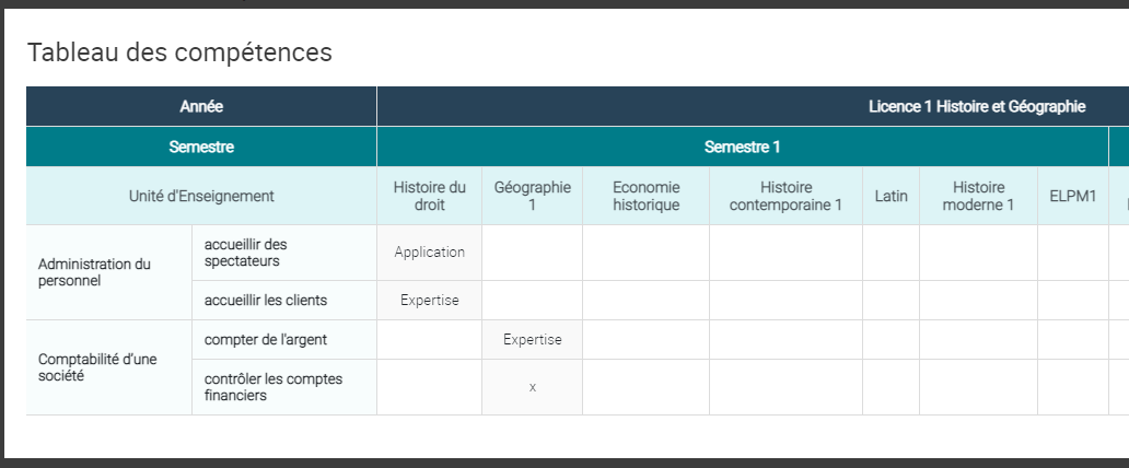 Un clic sur le bouton "Voir le tableau d'acquisition des compétences" ouvre le tableau ci-dessous :