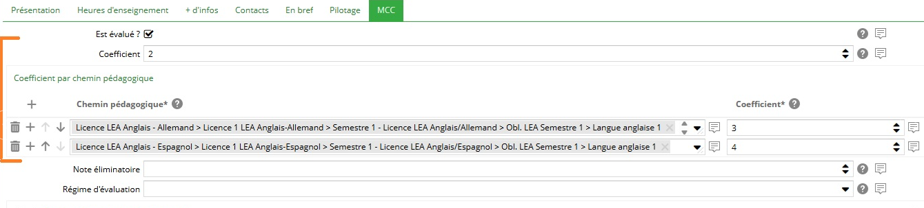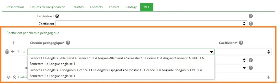 - Le coefficient diffère selon les chemins pédagogiques : dans ce cas, il faut remplir la valeur de chaque coefficient, selon son chemin pédagogique.