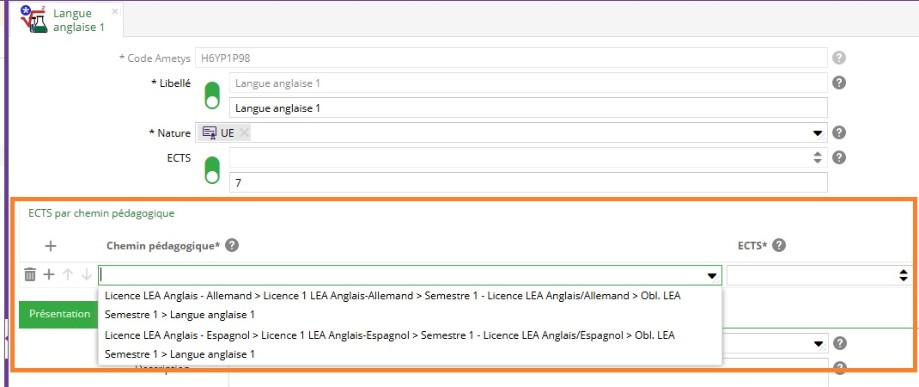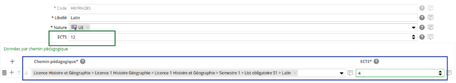 Quand un ELP est mutualisé, un champ multiple "ECTS par chemin pédagogique" est présent et permet de définir une valeur d'ECTS spécifique par chemin pédagogique.