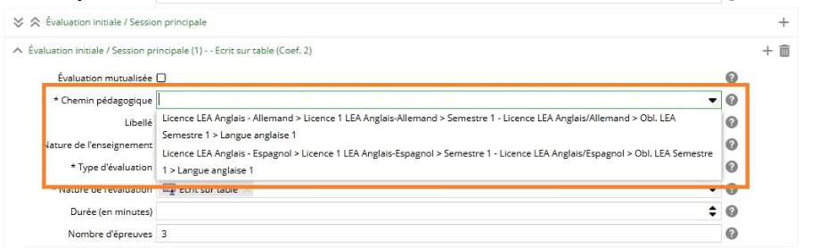 Il est alors obligatoire de renseigner le chemin pédagogique sur lequel est définie cette évaluation non mutualisée.