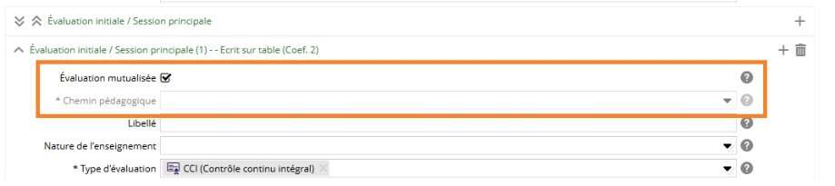 Quand une évaluation est mutualisée, elle est définie sur la totalité des chemins pédagogiques de l'ELP.