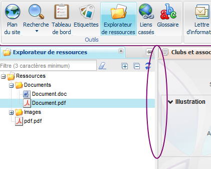 Il est possible d'ajuster la largeur de la zone latérale à l'aide de la souris. Une fois votre curseur positionné entre la zone latérale et la zone principale, maintenez le bouton gauche de la souris enfoncé et déplacez le curseur pour modifier la largeur de la zone à votre guise :