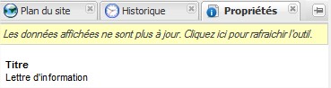 Lorsque vous effectuez des modifications dans l'application, il est possible qu'un de vos outils de la zone centrale ou latérale ne soit plus à jour. Dans un tel cas, vous serez notifié par l'apparition d'un bandeau jaune explicatif en haut de l'outil à actualiser :