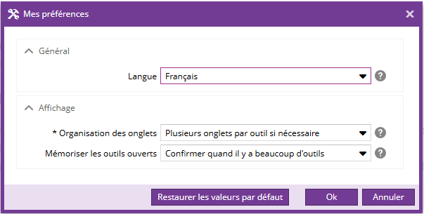 Les préférences permettent de personnaliser l'affichage des onglets dans la zone centrale.