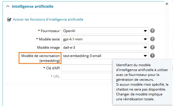 Pour configurer cette recherche sémantique, un nouveau paramètre de configuration globale "Modèle de vectorisation" est requis :