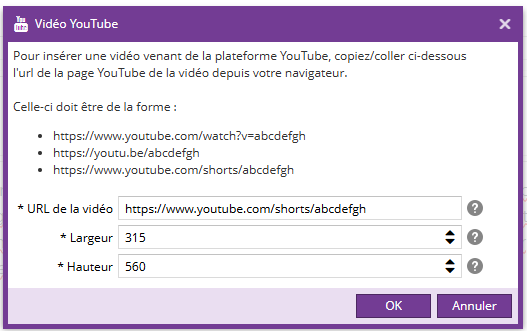Lorsque l’URL d’une vidéo est reconnue comme un Short, un format d’affichage adapté est automatiquement appliqué (315 × 560 px) pour une intégration optimale.